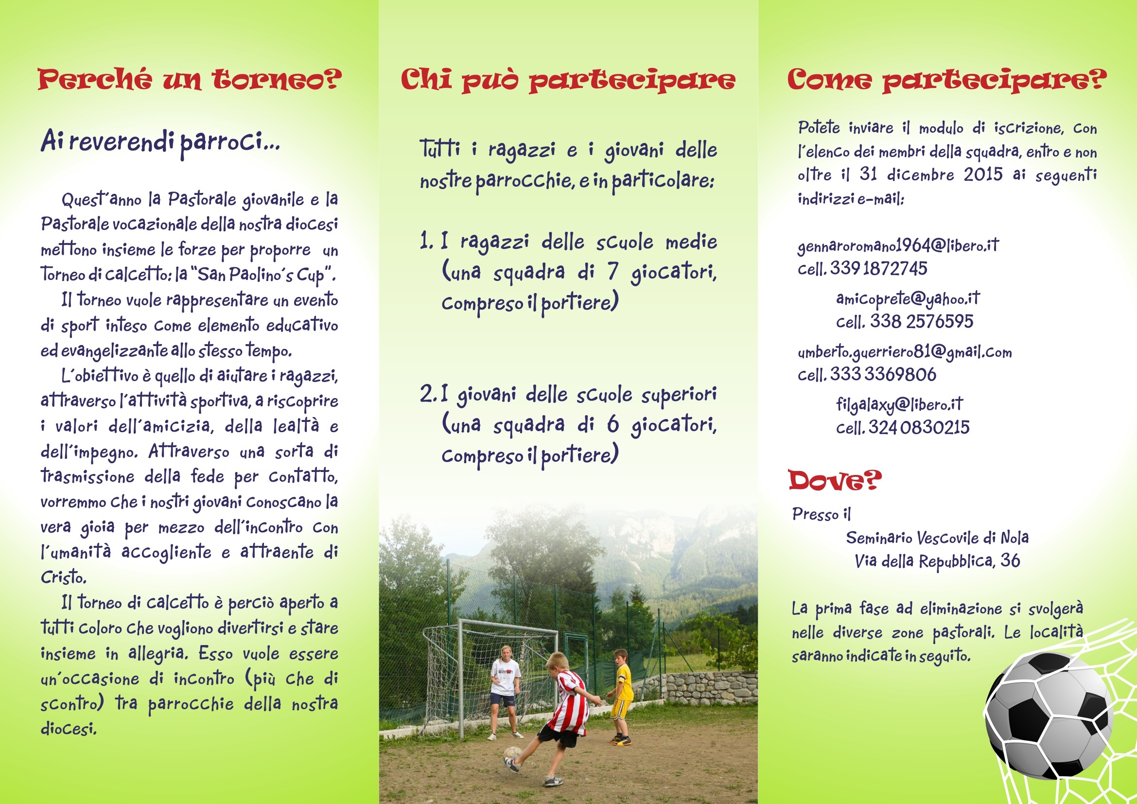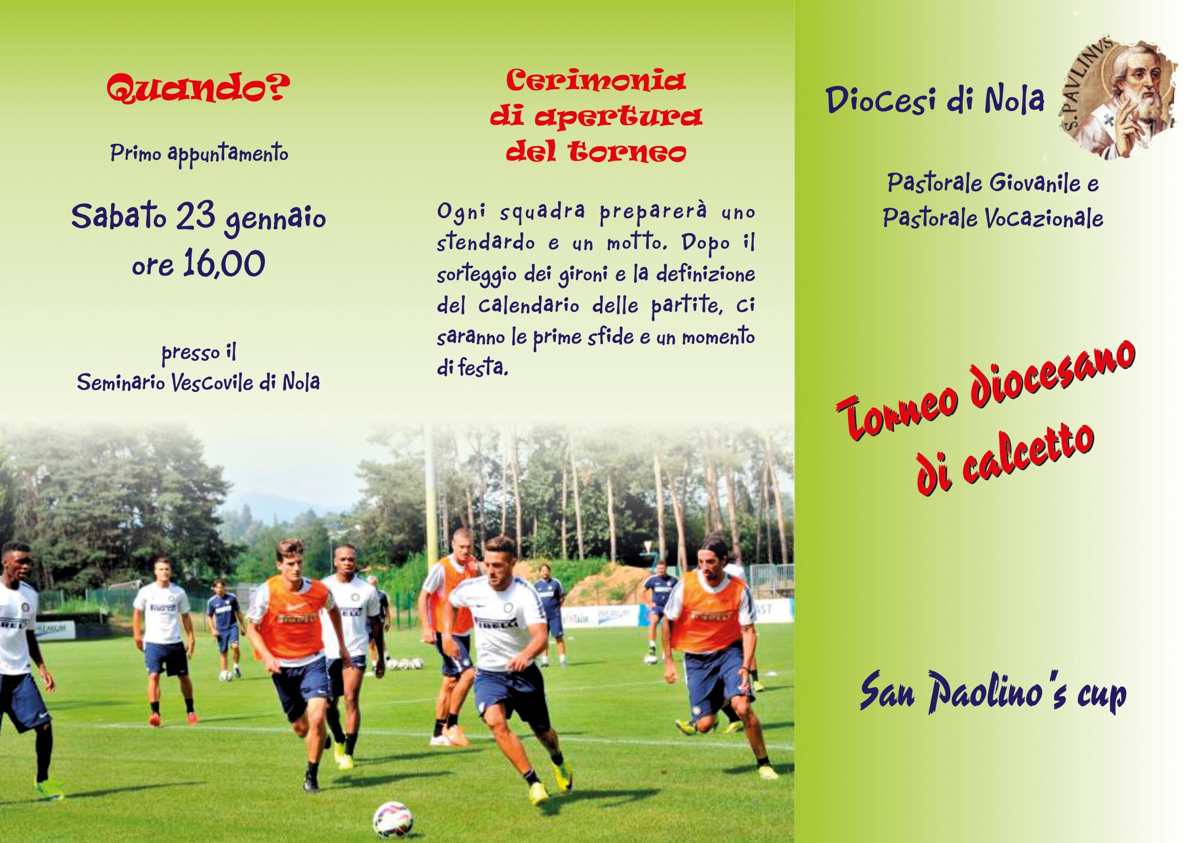 Proponiamo ai gruppi 12-14 e ai gruppi giovanissimi di Ac di partecipare alla San Paolino’s cup, ai due tornei diocesani di calcetto, differenziati per età, promossi dalla Pastorale giovanile e dalla Pastorale vocazionale. Primo appuntamento, per la definizione dei gironi, le prime sfide e un po’ di festa, sabato 23 gennaio. Negli allegati che seguono informazioni e contatti per ulteriori chiarimenti. Copertina brochure (409 download) – Interno brochure (474 download)