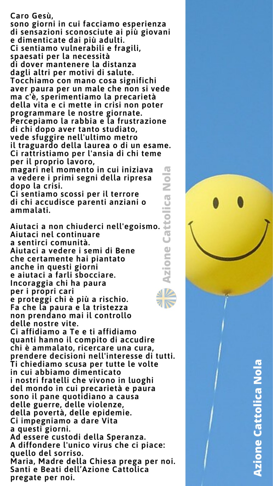 Lo ripetiamo, perchè lo crediamo con forza: è il momento in cui continuare ad essere pienamente l’Ac del sorriso, in cui incoraggiare e sostenere quanti hanno paura, in cui sforzarsi di vedere i semi di Speranza che Dio sta piantando nella Storia. Continuiamo a rilanciare sempre l’entusiasmo, a sentirci comunità, a tessere legami di vita buona, non dubitiamo mai del fatto che questo periodo straordinario finirà e torneremo all’ ordinarietà che tanto ci manca e che – come questi giorni ci stanno facendo capire – è una cosa bella e preziosissima!