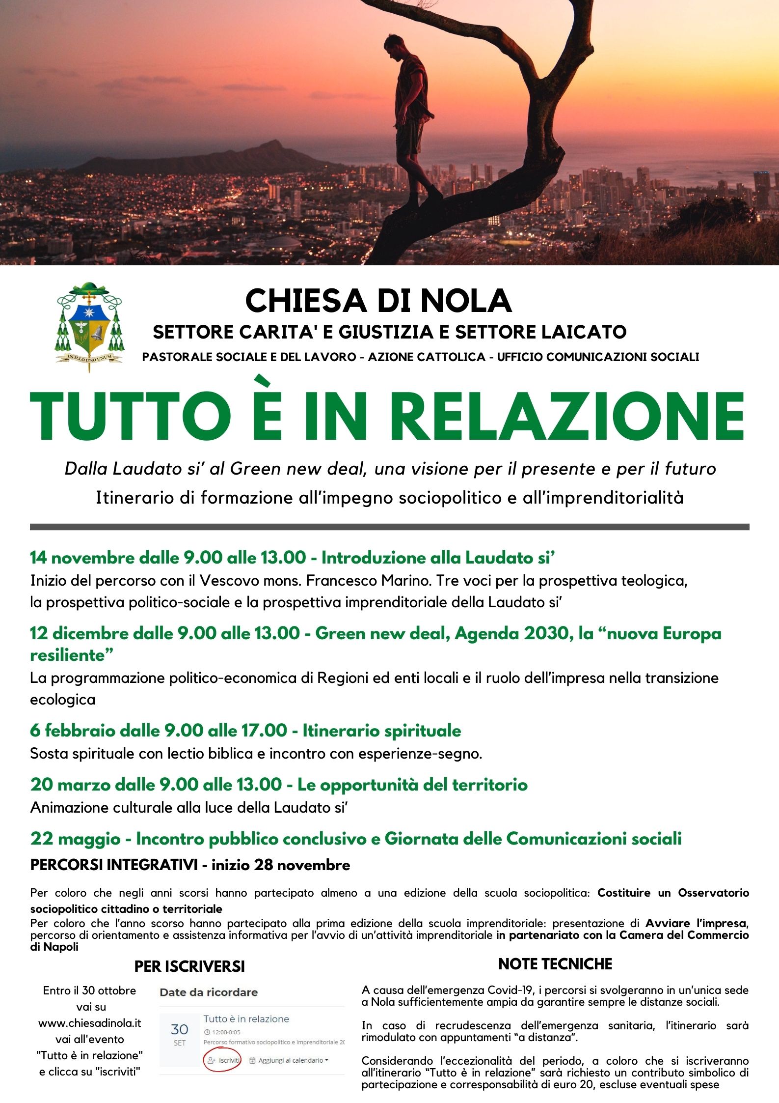 L’inizio di Tutto è in relazione è fissato per sabato 14 novembre con un incontro introduttivo alla presenza del vescovo di Nola Francesco Marino, principale promotore di questa esperienza formativa: «L’impegno dei settori di pastorale responsabili della formazione sociopolitica e imprenditoriale è fondamentale per la diocesi e per il territorio – sottolinea -. Oggi è necessario recuperare capacità di visione sul futuro delle realtà che abitiamo. Un futuro che, come papa Francesco continuamente ci ricorda, sia a misura d’uomo. L’impegno dei credenti per il territorio parte da un attento sguardo su di esso, ecco perché sono felice che i responsabili abbiano accolto il mio invito alla nascita di osservatori territoriali per la cui costituzione è previsto un percorso specifico per chi abbia già frequentato la scuola».